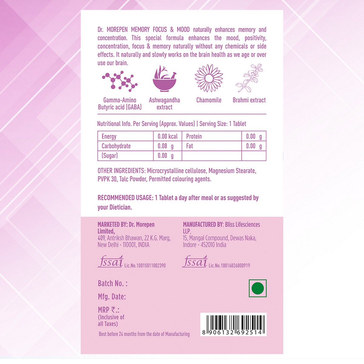 Dr. Morepen’s Memory Focus & Mood tablets make an advanced and scientific formulation for memory and mood enhancement. Our uniquely formulated supplement comes power-packed with Gamma-Amino Butyric Acid (GABA), Ashwagandha, Brahmi, and Chamomile along with vitamin B and magnesium to improve brain functions, memory, concentration, and mood.