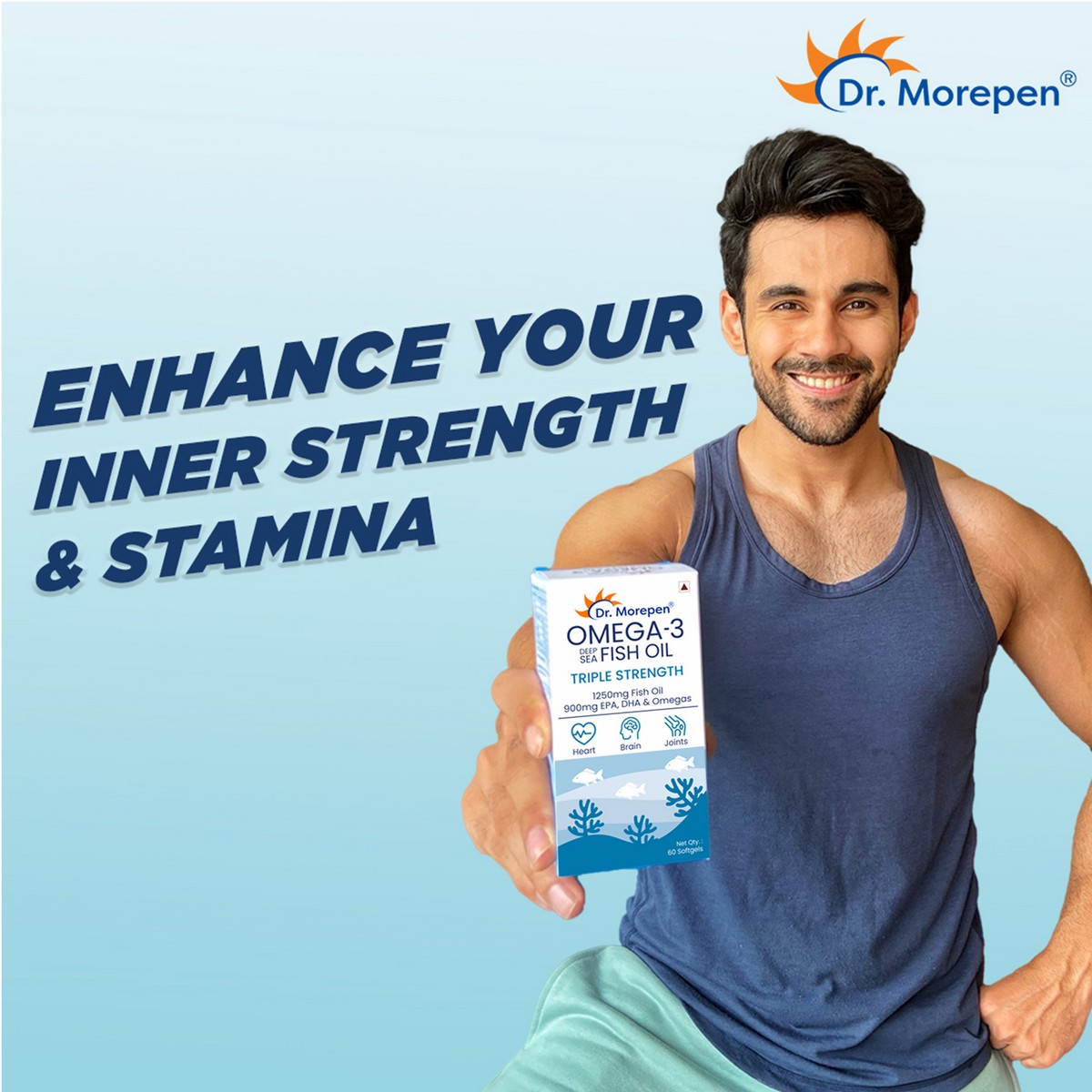 Dr. Morepen introduces the Deep Sea Omega-3 fish oil supplement for improved heart health, cognition, and stronger bones. Our Omega-3 fish oil soft gels come enriched with essential fatty acids such as Eicosapentaenoic acid (EPA) and Docosahexaenoic acid (DHA) our bodies need to stay in good health and function well. Though our bodies produce these polyunsaturated fats in small amounts; we need to get plenty of them either through diet or supplements for overall wellness.