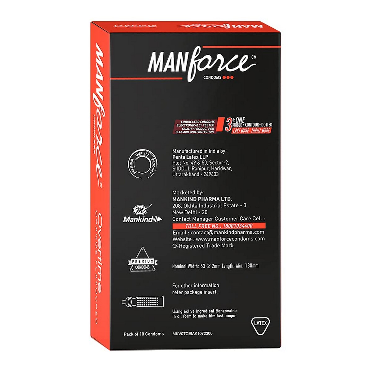 RIBBED-CONTOUR DOTTED CONDOMS WITH LONG LASTING PLEASURE: Manforce Overtime 3in1 Condoms work wonders during lovemaking with the added advantage of 4.5% Benzocaine Oil to make him go on for longer