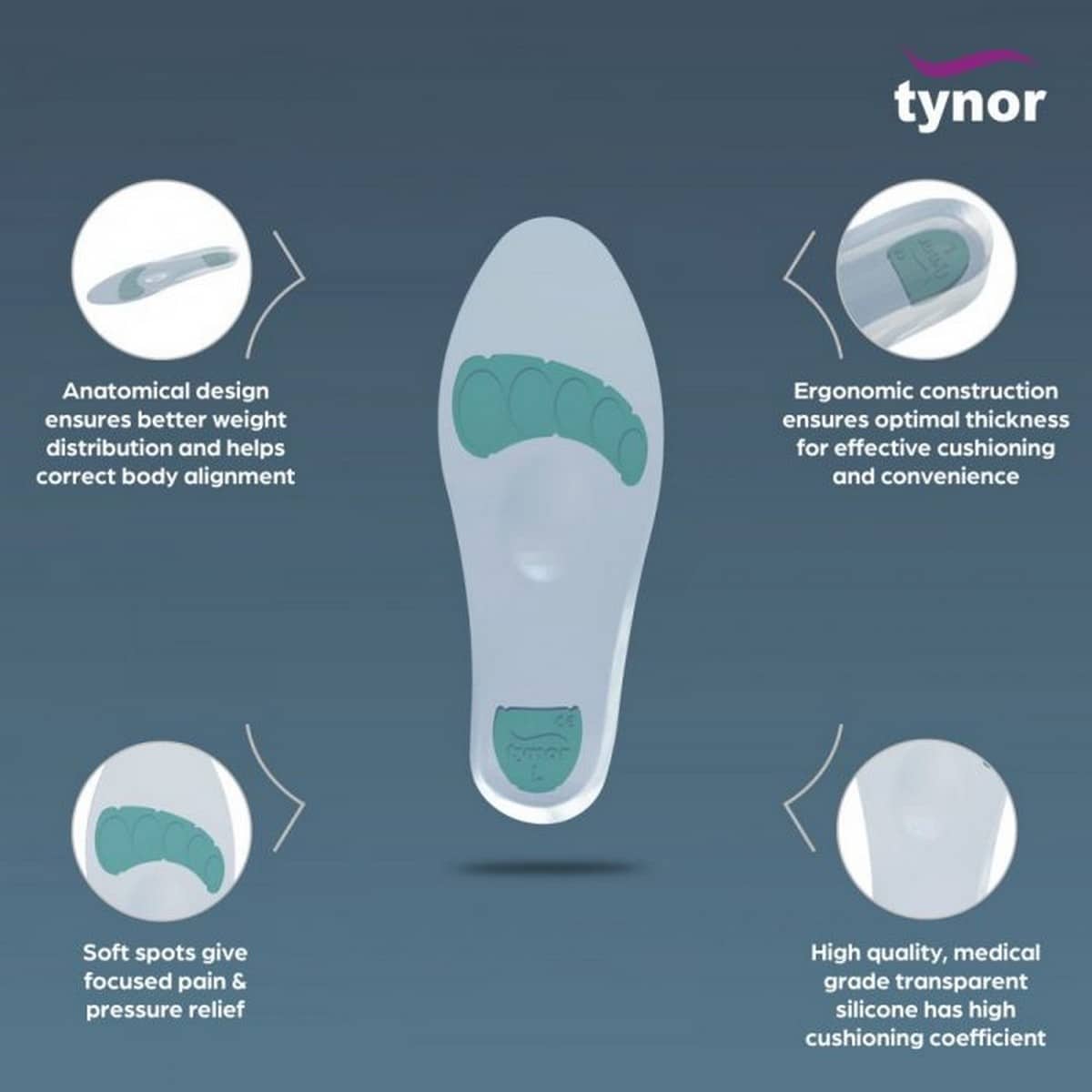 Tynor Insole Full Silicone (Pair) Are Designed To Provide Exceptional Comfort And Have Padded Pressure Relief Zones. It Alleviates The Painful Shock Waves And Weights That Are Sent To The Feet, Knees, And Spine.