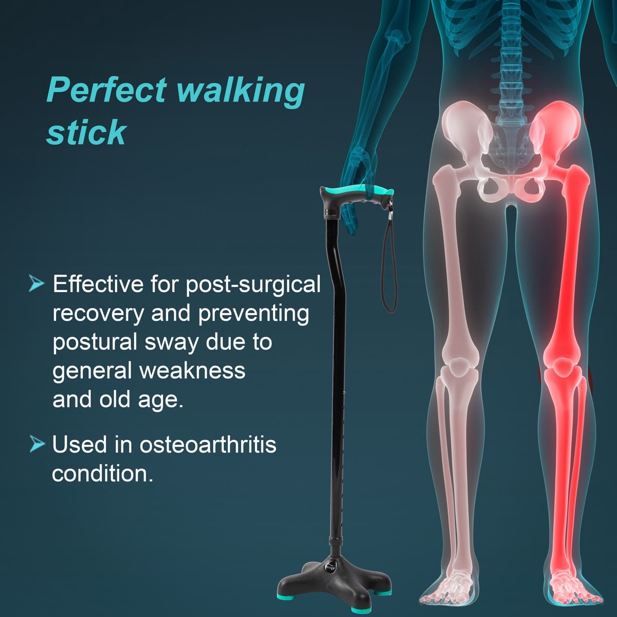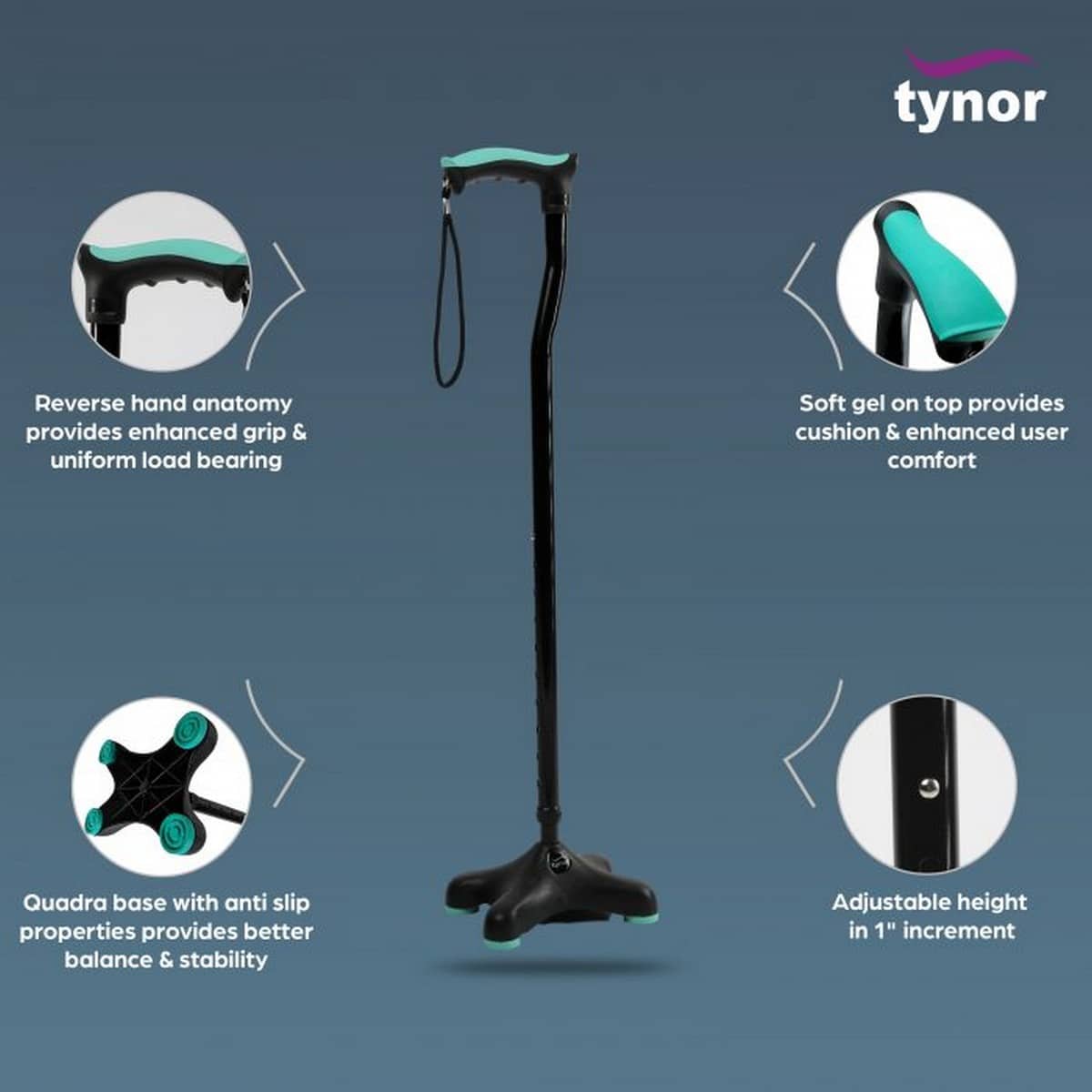 Tynor Quadra Stick Is An Aerodynamic Base Design Which Ensures High Stability, Confidence, And Load Bearing Capacity. It Is 20% Lighter Than Conventional Products. Ambidextrous Design Offers One Size For Both Hands.
