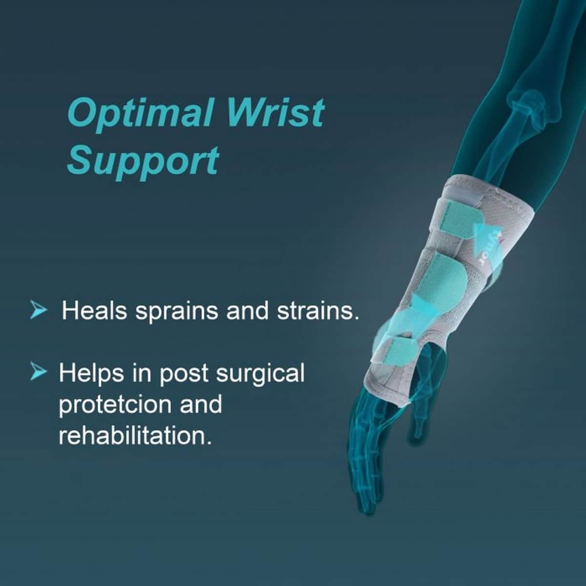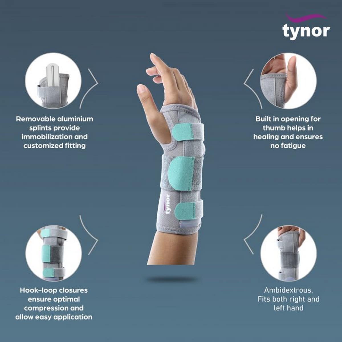 Tynor Wrist Splint Ambidextrous is a device used in various orthopedic conditions to immobilize and support the hand and wrist.?? It immobilizes the wrist in the dorsi-flexion/functional position while allowing full finger and thumb movement. It reduces local pain and inflammation by compressing and retaining body heat. It can be washed and removed for therapy sessions, keeping the hygiene factor intact.